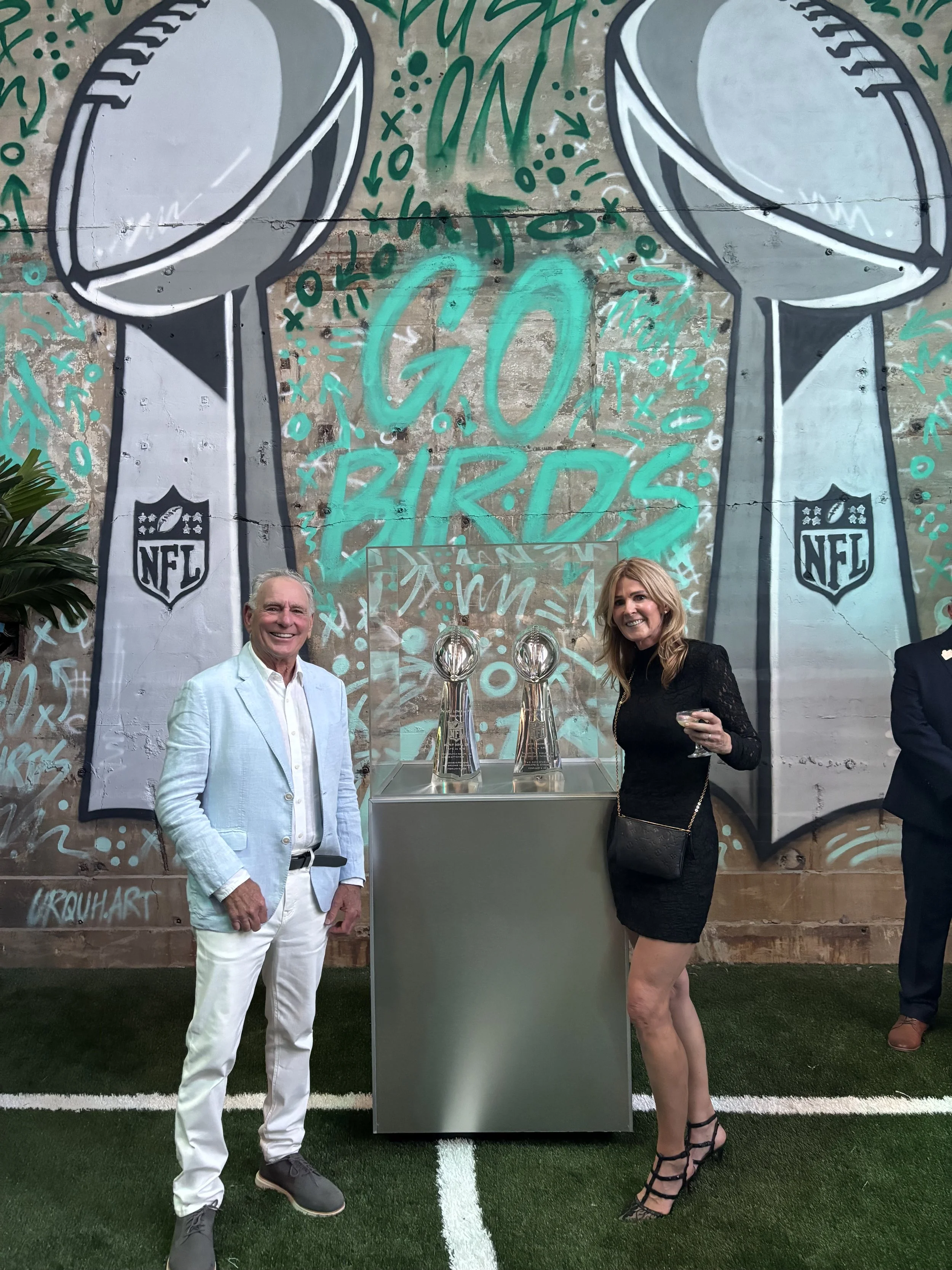 Dr. Lee Cohen pictured with Marlene Dhoore and the Super Bowl LIX Trophy at the Super Bowl LIX Championship Ring Ceremony